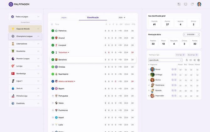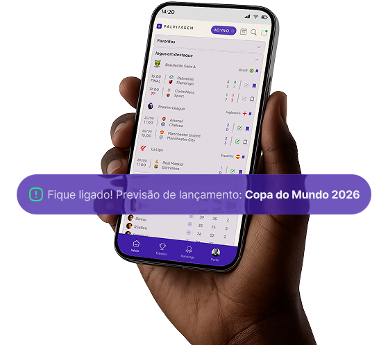 Palpitagem FC is a football prediction app. In the Palpitodromo you make predictions for matches from the main leagues and championships, create or join private leagues with friends, and follow the global ranking. All for fun competition with your crew.