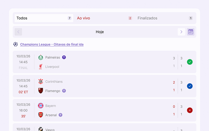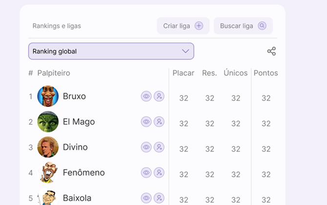 Create or join groups with people who share your passion for football. Palpitagem FC is the perfect stage to take that friendly rivalry from the pitch to the app.
