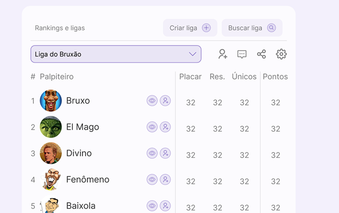 Create or join groups with people who share your passion for football. Palpitagem FC is the perfect stage to take that friendly rivalry from the pitch to the app.